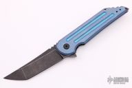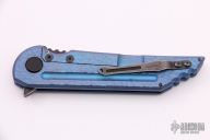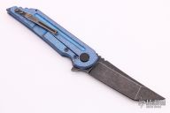 This Kwaiback from Jake Hoback was customized by Phil "The Preacher" Wozniak, it has a black stonewashed upswept/tanto blade, notched thumb-rest and flipper. CBP caged bearing pivot. "Ps23" stamped on lockbar. Handle is titanium with a dimple and anodized finish, titanium barrel spacers and tumbled clip, tip up carry reversible, left or right. This knife has an adjustable detent. Nice lockup, and blade seating, flips like a boss. Includes original wooden box. Excellent condition.