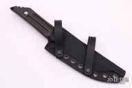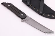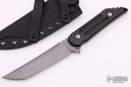 This Fixed Blade Kwaiback by Jake Hoback features a stonewashed tanto blade with notched thumbrest, .155" blade stock and 1.093" blade depth, full tang construction with carbon fiber scales. Comes with a kydex sheath and COA. Excellent condition.