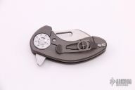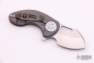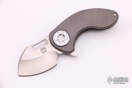 This Nano Framelock Flipper by Dave of Curtiss Knives features a tumble finished drop point blade with swedge, thumb hole, notched thumb rest and flipper. The handle is comprised of a tumbled titanium frame with steel lockface insert over a single barrel spacers. The machined titanium pocket clip is positioned for right hand, tip up carry. Includes padded and zippered nylon. Excellent condition with no signs of use or carry.