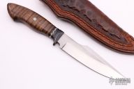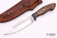 This Harpoon Utility by Chuck Schuette features a hand rub satin finished clip point blade with false top edge, notched thumbrest and hammer marked flats, .192" blade stock and 1.455" blade depth, hidden tang construction. The handle has a Railroad Spike steel guard that has been blackened, Tasmanian Blackwood grip with a fileworked nickel silver spacer, single mosaic pin. Comes with a beautiful hand tooled brown leather sheath. New from maker.