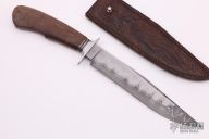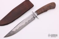 This Bowie by Journeyman Smith Shawn Ellis features a clip point blade with false top edge composed of stainless San Mai with a Damascus core. .272" Blade Stock and 1.405" blade depth, hidden tang construction. The handle has an 416 Stainless guard with a walnut grip. Comes with a brown leather sheath. Excellent condition.