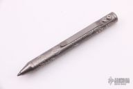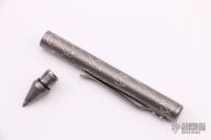 This NotaPen by Brian Fellhoelter is made of titanium and has a anarchy pattern. The end where the pen would be is a carbide glass breaker. This part also unscrews and there is a hollow compartment  that is approximately 3" deep. New from maker. I can think of a few things that would fit in this space. :)