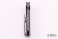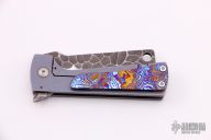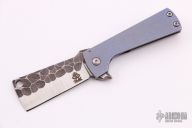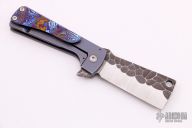 This Baby Fat Bastard by RichMade Knives features a cleaver style blade with rock pattern flats and a flipper. The handle has an anodized and tumbled titanium frame with a MokuTi tip up clip. Great blade seating, detent and lock up, rides on bearings. Includes a zippered case and COA dated 8/26/2018. Excellent condition.