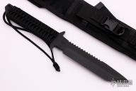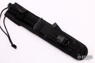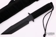 The BN-SS by Strider features a black tanto blade with a serrated top edge .248" blade stock and 1.490" blade depth, full tang construction. The handle has a black paracord wrapped handle. Comes with a black nylon sheath. New from maker.