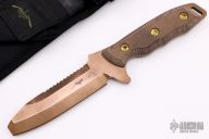 The MCMK (MK1) EOD Knife, designed for Mine Countermeasures features a copper beryllium blade ground by Ernest Emerson with a chisel-ground cutting edge for added strength and ease of sharpening, as well as a chisel-ground flat front edge. Additionally, square-saw teeth have been added to the top edge for tearing through soft materials.