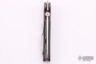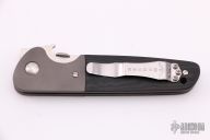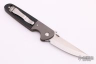 This custom Kwaiken by Emerson Knives features a hand-ground satin finished blade with thumbdisc, wave features and notched thumbrest. The handle has bead blasted and dovetailed titanium bolsters, and black paper micarta scales, bead blasted titanium liners, new style tip up stainless steel clip. Includes original box and papers. Nice detent, lockup and blade seating. New from makers recent online drawing.