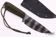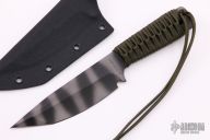 This knife by Mick Strider features a tiger stripe blade with false top edge, .221" blade stock and 1.466" blade depth, full tang construction with paracord wrap. Comes with kydex sheath. New from maker at the CCKS.