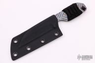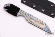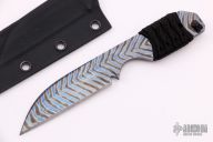 This knife by Strider Knives features a flamed titanium blade with chisel grind but the final edge is ground on both sides, .126" blade stock and .950" blade depth, full tang construction. Comes with kydex sheath. New from maker