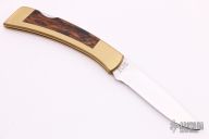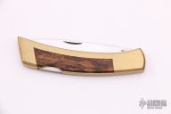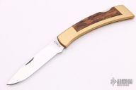 This large Folding Sportsman by Gerber features a polished drop point blade with nail nick. The handle has a brass frame with wood inlays. Excellent condition. Comes with original box.