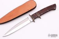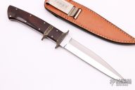 This sub-hilt fighter boot knife by Harold Corby features a mirror polished blade with sharpened top edge, .183" and .925" depth, full tapered tang construction. The handle has an engraved nickel silver guard and sub-hilt, cocobolo scales. Comes with a brown leather boot sheath and a zippered case. Has some patina on the guard, otherwise excellent condition.