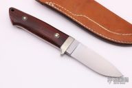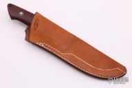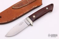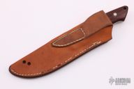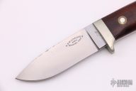 The classic Drop Point Hunter that made Bob Loveless designs so famous. Satin finished drop point blade with the "R.W. Loveless maker Riverside, Calif." logo. Full tapered tang construction. .197" Blade Stock 1.062" Blade Depth. The handle has a nickle silver guard and cocobolo scales with red liners, lanyard hole. "A-X" on ricasso. Comes with a brown leather sheath. Has some minor oxidation on the spin of the blade and some patina on the fittings, otherwise good condition. Comes with a zippered case.