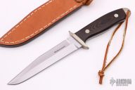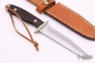This custom Fighter by Dave McDearmont features a bead blasted double-edged blade with .179" blade stock and 1.135" blade depth, full tapered tang construction. The handle has a nickel silver guard and butt, black linen micarta scales with nickel silver pins. Comes with a brown leather sheath. Has a little patina on the fittings, otherwise excellent condition.