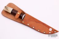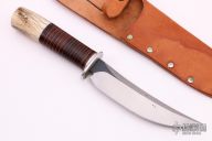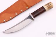 This Scagel Style Buffalo Skinner by John Greco has an upswept satin finished blade with black oxide flats, .201" blade stock and 1.316" blade depth, hidden tang construction. The handle has an aluminum guard, stacked leather and stag grip with red and brass spacers. Comes with a brown leather sheath and a zippered case. Has some light scratches and stains on the blade, otherwise good condition.