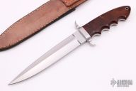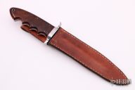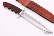 This Fighter by Willie Rigney features a hand rub satin finished double-edged blade with .244" blade stock and 1.242" blade depth, full tapered tang construction. The handle is comprised of a mirror polished stainless steel guard with ironwood burl scales over red liners. Comes with original brown leather sheath. Includes a padded zippered case. Excellent condition.