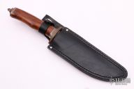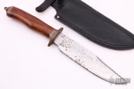 This Hunters Bowie by J.P Miller features a clip point blade with sharpened top edge, this knife at one point had a nice hand rub satin finish, it now has alot of rust on the blade, .231" blade stock and 1.555" blade depth, hidden tang construction. The handle features a steel guard with lashing holes, steel butt and tang nut, and a wood grip. Includes a black leather sheath. Has rust on the blade and fittings, but otherwise still a great knife if it were cleaned up a bit. Comes with a zippered case.