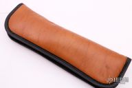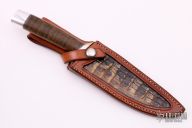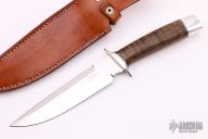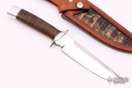 This knife by Rodney Rogers features a mirror polished blade with a sharpened top edge, .164" blade stock and 1.328" blade depth, hidden tang construction. The handle has a nickel silver guard and an aluminum butt with a curly wood grip, black and aluminum spacers. Comes with a brown leather sheath with alligator inlay. Excellent condition. Comes with a zippered case.