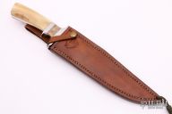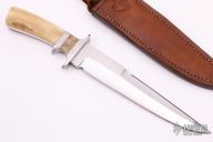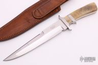This Sub-hilt fighter by Frank Dilluvio has a mirror finished blade with sharpened top edge, .247" blade stock and 1.543" blade depth, full tang construction. The handle has a stainless steel guard and sub-hilt, sheep horn scales. Comes with a brown leather sheath with clip. Excellent condition. Comes with a zippered case.