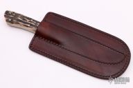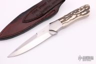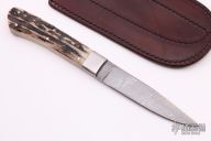 This Fighter by Claude Montjoy features a hand rubbed satin finish blade with a sharpened top edge, .194" stock 1.155" blade depth, full tapered tang construction. The handle has a stainless steel dovetailed bolsters, stag scales and red liners. Comes with a hand tooled black/brown leather sheath and a zippered case. Has a few light scratches, otherwise excellent condition.