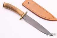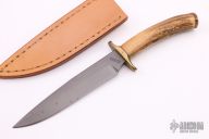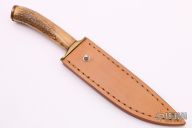 This custom fighter by John Greco features a grey coated blade with a false top edge, .244" blade stock, 1.179" blade depth, hidden tang construction. The handle has a brass guard and butt, stag grip and red/brass spacers. Nice feel in hand. Comes with brown leather sheath. Has a couple stains on the blade, otherwise excellent condition. #5 stamped on ricasso.