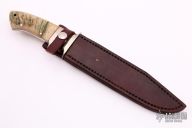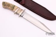 This Sub-Hilt Fighter by SL Terrill features a hand rub satin finished blade with sharpened top edge, .249" Blade Stock. 1.262" Blade Depth. Full tapered tang construction. The handle features nickel silver guard and sub-hilt, sheep horn scales with red liners. Includes a brown leather sheath and a zippered case. Has some light scratches and patina, otherwise excellent condition.