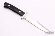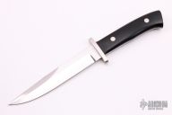 This Fighting knife by George Herron features a mirror polished blade with a sharpened top edge, .188" blade stock and 1.066" blade depth, full tapered tang construction. The handle has a stainless steel guard, black linen micarta scales with red liners. Comes with a zippered case. 2592 on the tang. Excellent Condition.