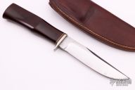 This knife by Morseth features a satin finished laminated steel blade, .177" blade stock and .955" blade depth, hidden tang construction. The handle has a nickel silver guard, maroon linen micarta grip and red/white/black spacers. Comes with a brown leather sheath and zippered case. Has a few light scratches, otherwise excellent condition.
