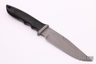 This knife by Steve Mullin features bead blasted blade with sharpened top edge, .201" blade stock and 1.395" blade depth, hidden tang construction. The handle has a bead blasted stainless steel guard with a black paper micarta grip with a lanyard tube. Nicely balanced knife. Has some scuffs and scratches, otherwise good condition.