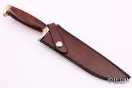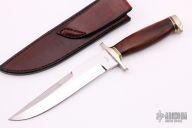 This fighter by Rick Hill features a mirror polished blade with sharpened top edge, .264" blade stock and 1.204" blade depth,  hidden tang construction with nickel silver guard and butt, wood grip and nickel silver and brass spacers. Comes with a brown leather sheath, this sheath is for a Jim Siska knife, but it fits nicely. Excellent condition. #132 on the blade.