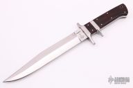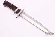 This Sub-Hilt Fighter by Rob Davidson features a mirror polished blade with a sharpened top edge, .213" blade stock and 1.215" blade depth, full tang construction. The handle has a stainless steel guard and sub-hilt with ironwood scales. Comes with a zippered case. #575 on the blade. Has some scratches, stains and rust spots, otherwise good condition.