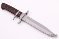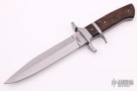 This Sub-Hilt Fighter by Devon Butch Beaver features a bead blasted double-edged blade, .245" blade stock and 1.228" blade depth, full tapered tang construction. The handle has a stainless steel guard and sub-hilt with rag micarta scales. Comes with a zippered case. Has a stain on the ricasso, otherwise excellent condition.