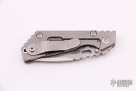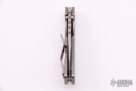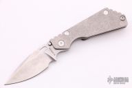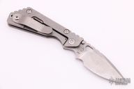 This PT by Mick Strider features a stonewashed blade with notched thumbrest and thumbhole. The handle has a stonewashed titanium frame with matching tip up clip. Excellent condition.