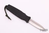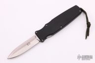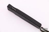 This Asp OTF auto opens by pressing down on the bar on the handle spine. The knife closes by pressing the locking mechanism on the opposite side and pulling the charging handle on the rear. Very strong and fast opening. Both edges of the blade are sharpened. Nicely contoured black aluminum handle. This one has no number or markings on the handle. Has a scratch on the blade from firing, otherwise excellent condition.