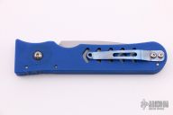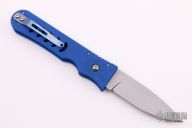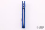 This side-opening automatic by Rob Dalton features a bead blast blade and blue G10 handle. Anodized titanium clip, tip up carry. Strong and fast coil-spring opening. Excellent condition. This knife is sterile with no markings.