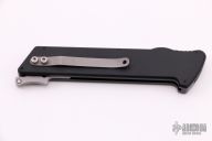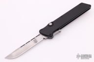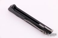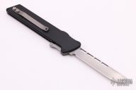 This M-6 OTF automatic by Rob Dalton features a bead blasted blade and a black aluminum handle with a tip up titanium clip. Fires via push button and retracts by holding the button and moving the slider on the side of the knife. Excellent condition.