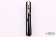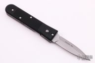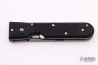 This "The Felon" by Rob Dalton features a bead blast blade with a partially sharpened top edge, black G-10 scales and bead blasted stainless steel liners, black G-10 backspacer. To open you press a lever on the liner to release the coil spring. Strong opening action. Liner lock. Excellent Condition. Comes with original box. Prototype 06