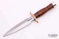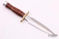 The Model 2 is a heavily made dagger or dirk. This knife has an 6" carbon steel blade with .185" blade stock and 1.120" blade depth, hidden tang construction. The handle has a double brass guard, stacked leather grip with red/white/blue spacers, duralumin butt. Excellent condition.