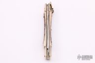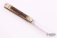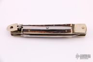 This leverlock auto by Hubertus features a spear point blade, nickel silver double bolsters, stag scales, and brass liners and pins. Opens with a nice snap. Very fast opening. This is the largest automatic knife that Hubertus Makes. Has some light scratches, otherwise excellent condition.
