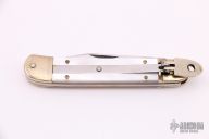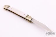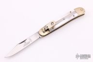 This leverlock auto by Hubertus features a clip point blade, nickel silver double bolsters, mother-of-pearl scales, and brass liners and pins. Opens with a nice snap. Very fast opening. Has some patina and light scratches, otherwise excellent condition.