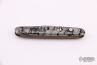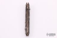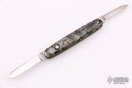 This 2 blade press button auto features 2 blades, one is 1.75" and the other is 2". Has celluloid scales with brass liners. Has some patina on the blades, otherwise excellent condition for its age.