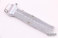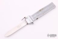 This vintage OTF by Bonsa features a mirror polished flat ground blade. The handle is chrome plated stainless steel with a trap door covering the blade. This knife has a safety. Has some light scratches, otherwise excellent condition.