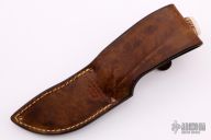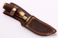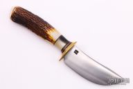 This Skinner by Jim Behring features a satin finished convex ground upswept blade with a false top edge, .162" blade thickness and 1.208" blade depth, hidden tang construction. The handle has a brass guard, stag grip with a walrus ivory butt cap, black/red/brass/horn spacer pattern. Great look and feel. Comes with brown leather sheath with beaver tail inlay. Excellent condition. Dated 2019. Comes with a zippered case.
