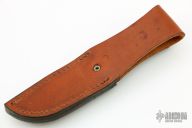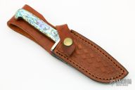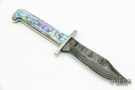 This Heritage Series Baby Bowie by Bear and Son features a Damascus clip point blade with false top edge, .121" blade stock and .858" blade depth, full tang construction. The handle has a satin finished stainless steel guard, abalone scales with nickel silver pins and escutcheon. Comes with a hand tooled brown leather sheath, original box and papers. #090 of 250. Excellent condition.