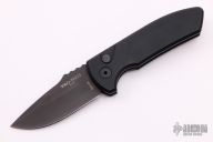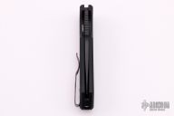 The Short Bladed Rockeye, or SBR for short, is a compact version of the outstanding full sized Rockeye Auto. Both knives are designed by Marine Corps knife designer Les George, who’s ergonomic hard use knives have been faithfully translated to automatic versions by Pro-Tech. The SBR features a compact design, with a 2.5″ blade that’s built for a multitude of cutting tasks. A pocket milled spine adds extra grip and depth to the design. The SBR features solid black hard coat anodized handles, blasted hardware, black DLC coated deep carry clip, and a black blade. FPR #476. Scuffs and scratches are visible on the blade and handle.