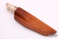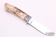 This Drop Point Hunter from James Sponaugle features a mirror polished drop point blade with .188" blade stock and 1.043" blade depth, full tapered tang construction. The handle is comprised of an engraved stainless steel single guard with beautiful mammoth ivory scales over red liners/spacers. Includes leather sheath with belt loop. New from maker.