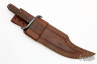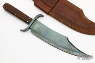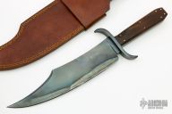 This Juan Padillo Bowie Replica by Gulzar Ahmed features a temper finished blade with fileworked spine, .258" blade stock and 2.207" blade depth, full tang construction. the handle has a blackened steel guard and hardwood scales with brass pins. Comes with a hand tooled brown leather sheath. Excellent condition.