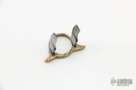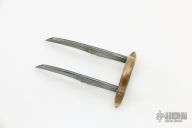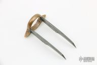 This Naaga Nukeele by Paul Cooper is very interesting. It features two random pattern Damascus blades mounted to a mokume ring that is size 13. Comes with a zippered case. The blades are attached to the ring with a brass pin and are both soldered. New from maker.