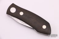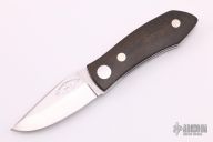 This Barry Wood swing lock folder features a satin finish blade and satin finish stainless steel frame with black linen micarta scales. This is a very unique scissor opening folder, which when the blade is fully open and locked in place is almost a fixed blade knife. The handle is nicely contoured for a comfortable grip. Opening is accomplished by lighting pressing down and outward at the rear indentation on the spine, which releases the locking pin and allows one side of the handle and the blade to rotate down then forward until the blade locks in the forward position. The one side of the handle continues to rotate back until it locks in place. Closing requires the same slight thumb pressure at the indentation to release the locking pin, then the one side of the handle is rotated back and around, catching the blade and aligning both with the other side of the handle in a locked closed position. Has some light scratches on blade and handle. Good condition for its age.