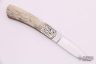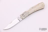 This lockback by Harvey Otis McBurnette features a mirror finished blade with nail nick. The handle has engraved and dovetailed nickel silver bolsters, bone covers, fileworked nickel silver liners, stainless steel backspacer. Nice lockup, function and blade seating. Excellent condition.