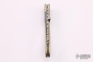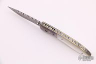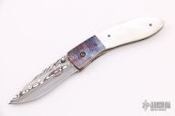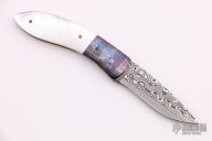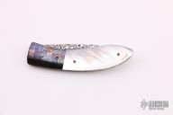 This linerlock by Jason Jacks features a Damasteel blade with fileworked spine and single thumbstud with mother of pearl inlay. the handle has blued mosaic Damascus dovetailed bolsters, mother-of-pearl scales, anodized titanium liners, fileworked Damasteel backspacer. Nice detent, lockup and blade seating. Excellent condition.