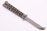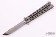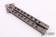 This Balisong by Terry Guinn features stonewashed harpoon style blade with swedge. The handle is comprised of a tumbled skeletonized titanium frame over a stainless steel backspacers. T latch in pommel. Pivots on IKBS bearings. Excellent condition. Prototype